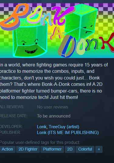 In a world, where fighting games require 15 years of practice to memorize the combos, inputs, and characters, don't you wish you could just... Bonk them? That's where Bonk-A-Donk comes in! A 2D platformer fighter turned bumper-cars, there is no need to memorize tech! Just hit them!